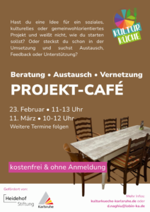Das Projekt-Café ist ein offenes, kostenfreies Angebot der Projekt-Manufaktur. Wir bringen über 10 Jahre Erfahrung in der Entwicklung, Umsetzung und Finanzierung von sozialen und kulturellen Projekten mit – und teilen dieses Wissen gerne weiter. In entspannter Atmosphäre gibt es Raum für Austausch, kollegiale Beratung und praktische Unterstützung rund um Projektideen und Vorhaben. Gemeinsam schauen wir zum Beispiel: Wie kann aus einer Idee ein konkretes Projekt werden? Wo hakt es gerade in der Umsetzung?Welche Förder- und Finanzierungsmöglichkeiten gibt es? Wer könnte unterstützen oder mitmachen? Das Angebot richtet sich an Ehrenamtliche, Kulturschaffende, kleine Initiativen, Freiberufler*innen und alle Menschen, die ihre Ideen für ein besseres Zusammenleben in Karlsruhe voranbringen möchten.