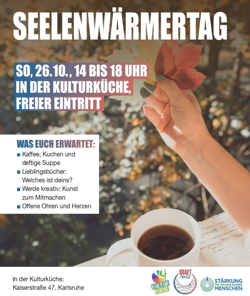 Die Tage werden kürzer, das Sonnenlicht ist golden, und wir tun etwas für unsere Seele. An diesem Nachmittag zum Beispiel, indem Menschen ihre Lieblingsbücher vorstellen – vielleicht ist ein guter Tipp für dich dabei? Wer sich gern künstlerisch ausdrückt, kann mit Farben und Papier kreativ werden. Es gibt heiße Getränke, leckeren Kuchen und eine deftige Suppe. Und selbstverständlich offene Ohren und Herzen, um miteinander ins Gespräch zu kommen.