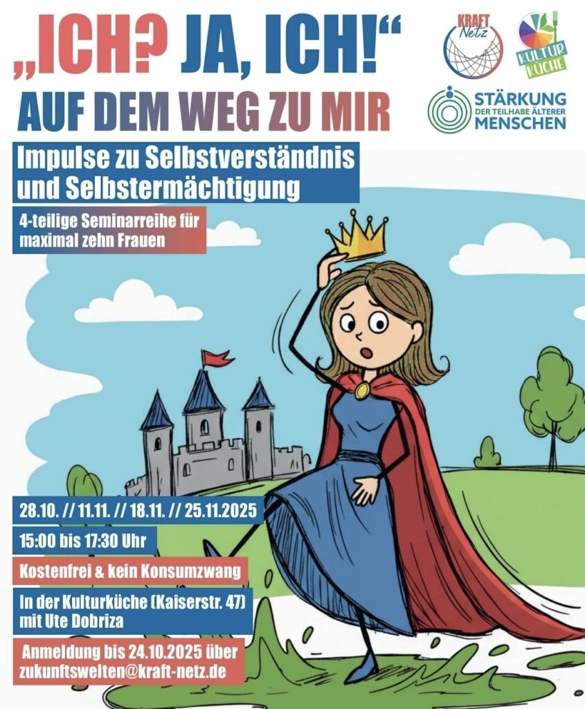 Ute Dobriza bietet an vier Terminen einen Austausch an und gibt Impulse zu Selbstverständnis und Selbstermächtigung. Eingeladen sind Frauen zwischen 17 und 77, die idealerweise an allen vier Nachmittagen teilnehmen können.