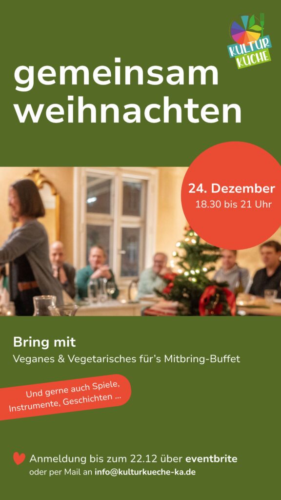 Der Abend ist kostenfrei. Spenden willkommen. Anmelden bis zum 22. Dezember über eventbrite. Oder per E-Mail an info@kulturkueche-ka.de.